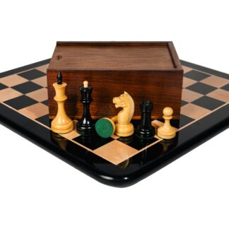 • 3.8” EBONISED REYKJAVIK STAUNTON WEIGHTED CHESS PIECES, 21” EBONY CHESS BOARD & BOX