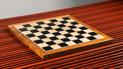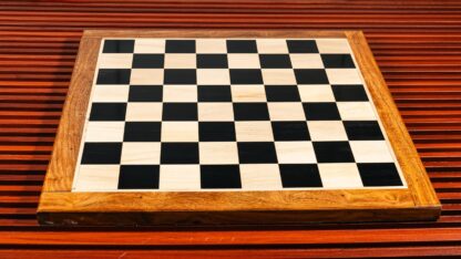 A stunning fusion of contrast and craftsmanship, this 17” chessboard features rich ebony wood squares beautifully framed with a golden rosewood border. The deep black of ebony pairs gracefully with the warm, natural tones of golden rosewood, creating a sophisticated and timeless aesthetic. Handcrafted to perfection, the board is finished with a smooth satin polish that enhances the natural grain and ensures lasting durability.